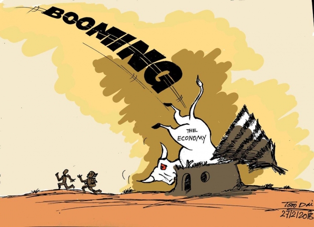 Sør-Sudans krigsprofitører opplever en "booming economy", mens folk flest sliter. Tegning av Tom Dai