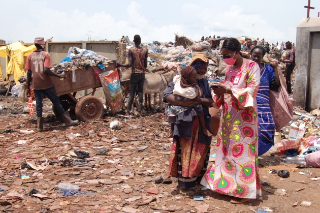 Strømmestiftelsens regionsjef for Vest-Afrika Rokiatou Démbele i samtale med plastplukker Maimouna Doumbia med datteren på armen på et stort avfallsdepot i Bamako. FOTO: Guri Wiggen.