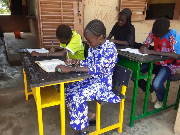 Elever i SAN i regionen Ségou, cirka 400 km nordøst for hovedstaden i landsbyen prøvesitter elever i Speedskolen de nye pultene av resirkulert plast. FOTO: Job Coulibaly.
