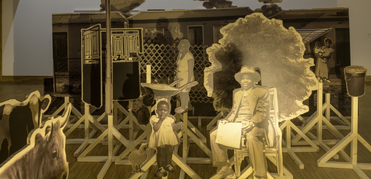 Afrika.no møtte Lebohang Kganye (1990) fra Sør-Afrika, som er en av kunstnerne bak utstllingen. Kganyes installasjon, “Mohlokomendi wa Tora” har fått sitt eget rom. Den sørafrikanske samtidskunstneren stiller ut figurer som er skåret ut i papp, og på Astrup Fearnley-museet i Oslo får vi se en gård med flere mennesker. Gjennom installasjonen forteller hun om familien sin, og hvordan de ble påvirket under og etter apartheidtiden. Fargene er dystre, og minner om gamle fotografier. Nyansene masker seg sammen og gjennom det klarer vi å skille de fine linjene og detaljene. Den Johannesburg-baserte kunstneren har fått mye oppmerksomhet både nasjonalt og internasjonalt. Hun beskrives som en av Sør-Afrikas ledende samtidskunstnere: